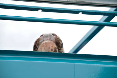 Transport of live animals in cattle truck. Bovine, cow, beef behind bars