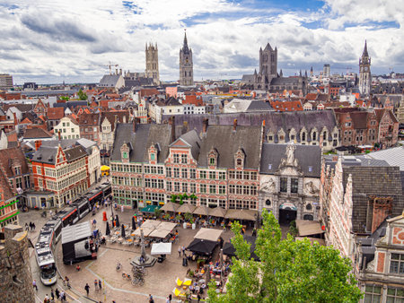 Ghent, Belgium - September 23, 2018: Seen from Gent Castle tower. Gray statue decorated gate to historic fish market among red brick facades of historic houses now restaurants. Cloudscape and towers on horizon.