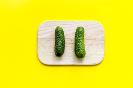 Make salad with fresh cucumbers. Vegetables on cutting board on yellow background top view.