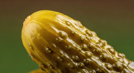 A close up macro shot of a single green dill pickle or gherkin, showcasing its textured, bumpy surface. This fresh, crunchy vegetable is often used as a snack or condiment.