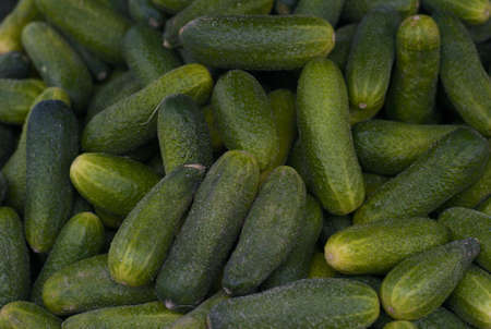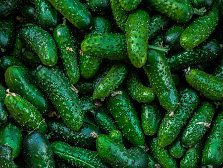 Heap, pile of bright green short little prickly cucumbers lie on top of each other in store, supermarket