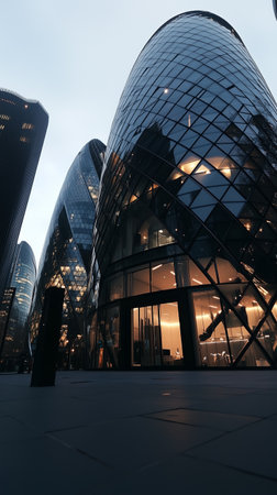 Modern glass skyscrapers reflecting city lights at dusk in a vibrant urban setting