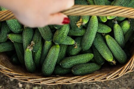 Fresh cucumbers from organic garden in basket. Gardening concept. Top view.