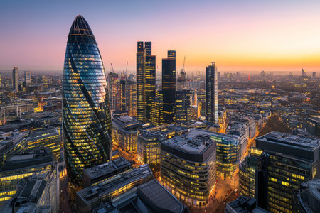 Generative AI : London England Panoramic skyline view of Bank and Canary Wharf central Londons leading financial districts with famous skyscrapers at golden hour sunset with blue s