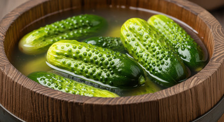 Fresh green pickles soaking in wooden bowl with brine