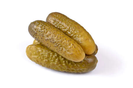 Pickled gherkins or cucumbers on white background.