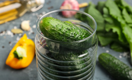 Jar with fresh cucumbers for preservation on table, closeup