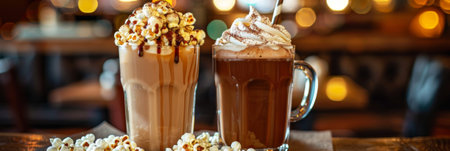 Cocoa Drink, Natural Cold Coffee with Whipped Cream and Caramel Popcorn, Cacao Milkshake, Frappuccino or Hot Chocolate with Milk, Lavender Syrup and Marshmallow, Generative AI Illustration