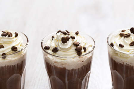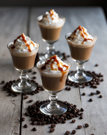 AI Generated. Three glasses of coffee with whipped cream and caramel syrup sit on a wooden table surrounded by coffee beans