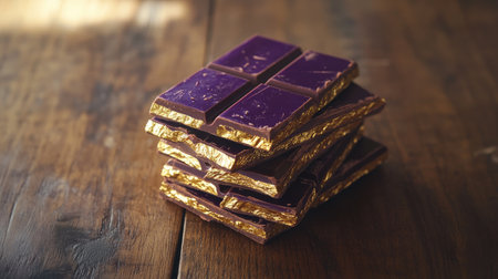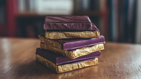 A visually appealing stack of dark chocolate bars wrapped in gold foil, showcasing a rich hue and inviting texture on a rustic wooden table.