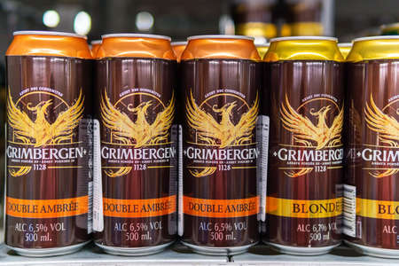 Tyumen, Russia-June 05, 2020: Grimbergen beer on a supermarket shelf. The brand name of a variety of Belgian abbey beers.