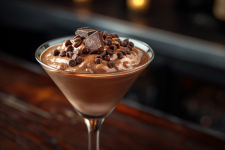 Rich chocolate martini topped with cream and cocoa chips, perfect for a sweet, sophisticated treat