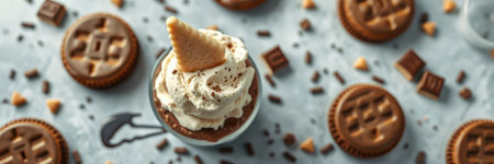 Dessert cup topped with whipped cream and a cookie cone surrounded by chocolate treats on a light background