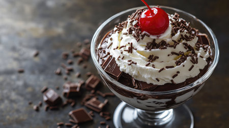 A tempting chocolate sundae served in a glass bowl, topped with whipped cream, chocolate shavings, and a bright red cherry, perfect for dessert lovers.