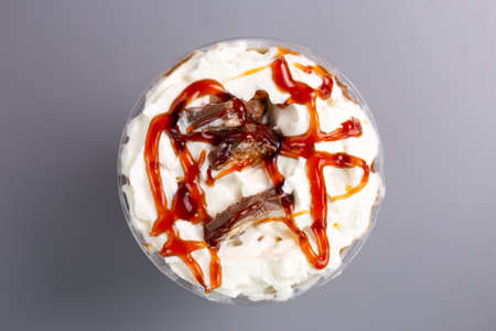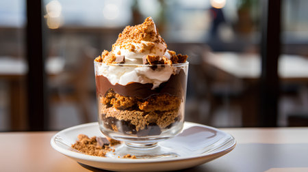 Sweet dessert in glass, rich chocolate mousse, crushed cookies, fresh whipped cream, topped with chocolate shavings, served with caramel sauce, garnished with mint leaf,