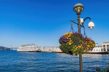 San Francisco, USA - June 6, 2022: view to Ghirardelli chocolate factory from Mareitime Garden with public park and recreation area.