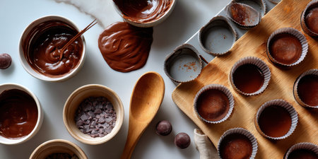 Wide shot chocolate molds half filled with chocolate, melted chocolate bowls and spoon creating