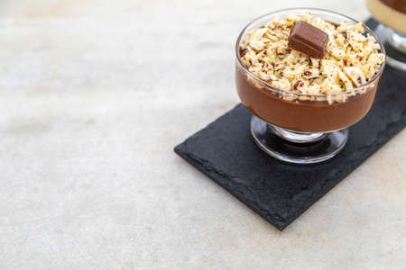 Delicious chocolate mousse with whipped cream and chocolate chips, selective focus