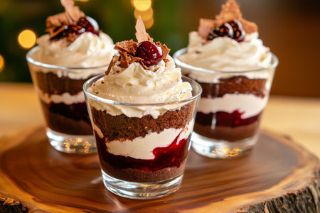 Three elegant dessert cups showcase layers of chocolate cake, whipped cream, and berries, creating a tempting treat against a wintry backdrop with soft lighting.