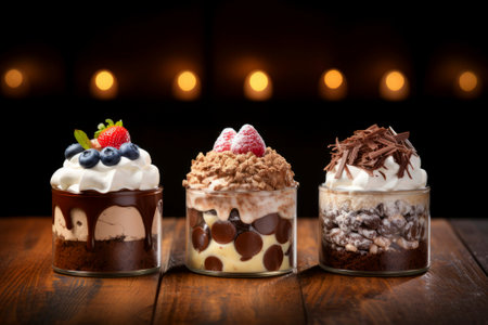 A stunning display of layered chocolate and cream desserts in elegant glasses, showcasing rich textures and inviting toppings, ideal for any special event or gathering.