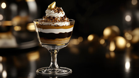 A beautifully crafted dessert in a glass featuring creamy layers of mousse and chocolate, set against a stunning blurred background to emphasize elegance.