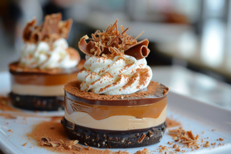 Mini chocolate cakes with cream and crunchy caramel pieces creating a delicious dessert