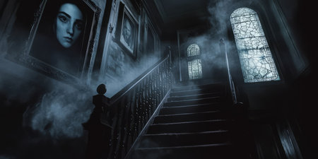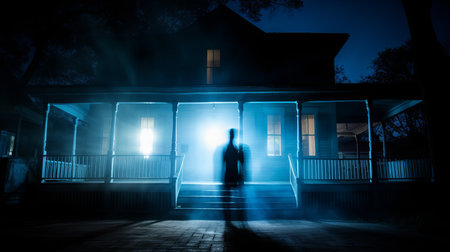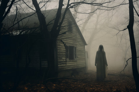 Ghostly horror background with dark atmosphere, shadowy phantom figure and chilling spooky mood, ideal for Halloween and scary design projects