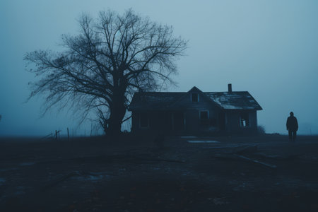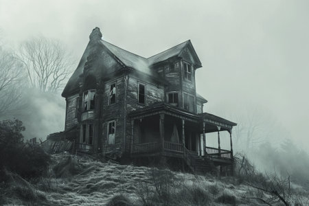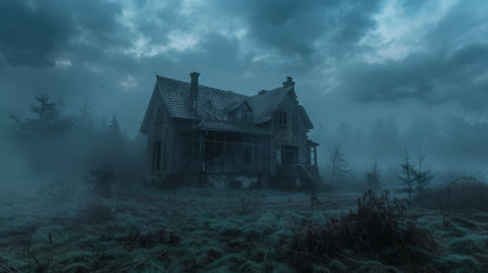 An aged house sits in an expansive field, enveloped in a dense layer of fog. The building's weathered facade and muted color palette create a sense of decay. The composition focuses on the architectural structure and its interaction with the natural elements. This imagery can be suitable for various editorial and conceptual projects.