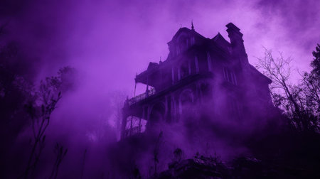 This haunting image features a gothic mansion enveloped in purple mist, creating a spooky atmosphere at dusk. The eerie scene captures the essence of mystery and abandonment.