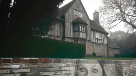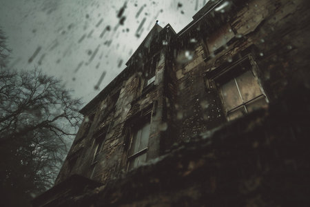 A low-angle view showcases an old house with a closed wooden door and shuttered windows. The exterior presents a weathered appearance with visible textures. Autumn leaves cover the ground. The composition and lighting create a mysterious atmosphere. Suitable for use in editorial content or concept illustrations.