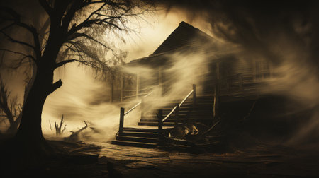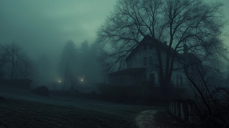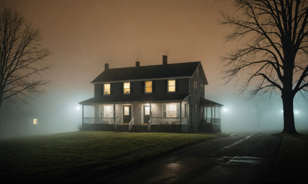 house surrounded by fog, with porch light shining through the mist, created with generative ai