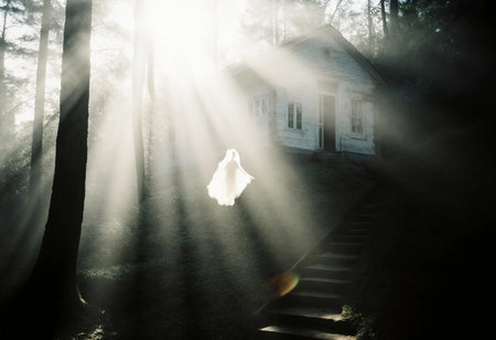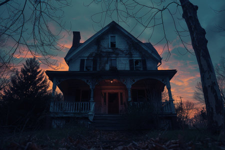 A spectral figure wearing a white sheet floats in front of an old, abandoned house at sunset, creating a spooky and eerie atmosphere with the haunting image of the dilapidated building and surrounding trees. AI generated image