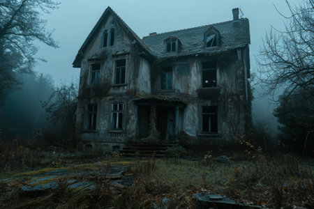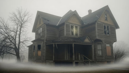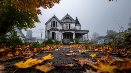 Decaying haunted house surrounded by thick fog and fallen leaves