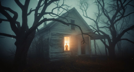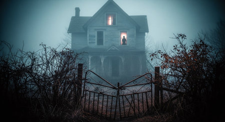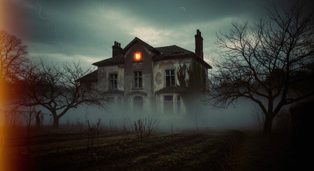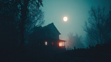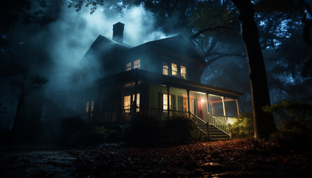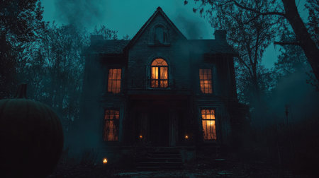 Haunted house with glowing windows, foggy night, copy space