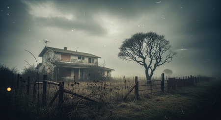 A creepy house with a dark sky and a tree in front of it. The house is old and abandoned