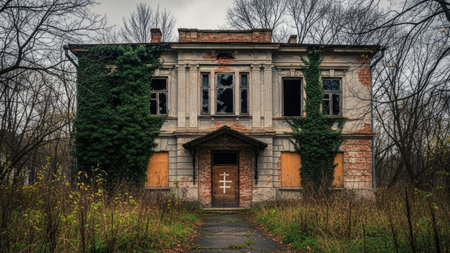 Dilapidated mansion, overgrown with vegetation, stands amidst autumn foliage, in a forest