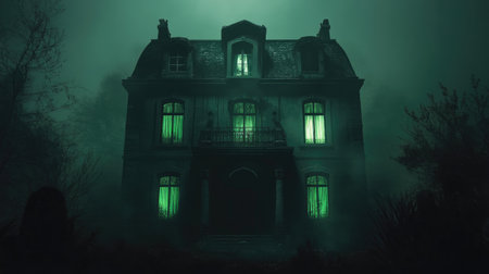Haunted mansion with eerie green lighting, foggy night, copy space