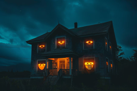 Haunted house with glowing jack o lanterns in windows creates spooky Halloween atmosphere at night