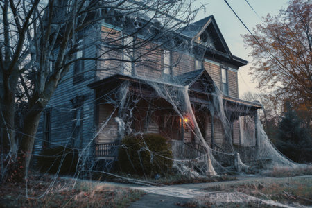 An eerie, abandoned house with a net covering the front yard, creating a haunting atmosphere, Rustic houses decorated with Halloween decor such as cobwebs and spiders, AI Generated