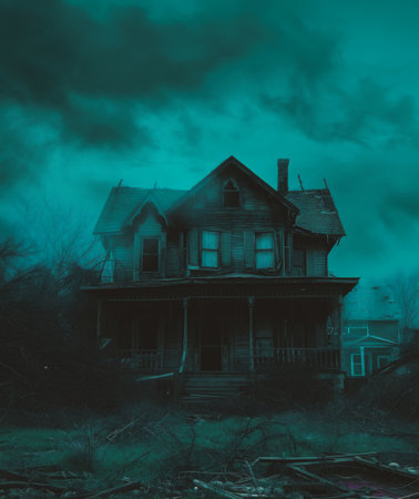 Abandoned house covered in spider webs under eerie twilight, creating a spooky atmosphere