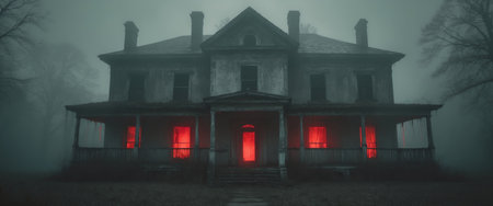 AI Generated. Creepy mansion shrouded in fog with boarded windows and eerie red glow from within