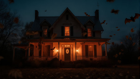 Haunted house with flickering candles in the windows, spooky night, copy space