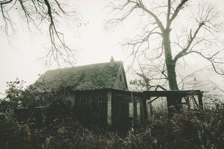 Abandoned house in a misty field. Halloween concept.