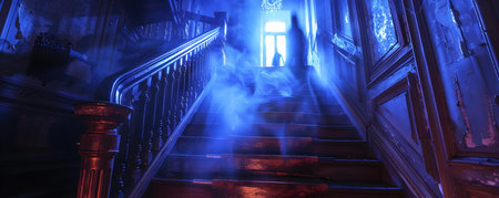 Ghostly Figure on Staircase: A Spooky Nighttime Scene in a Haunted Mansion. Concept Haunted Mansion, Ghostly Figure, Staircase, Spooky Nighttime Scene, Paranormal Activity