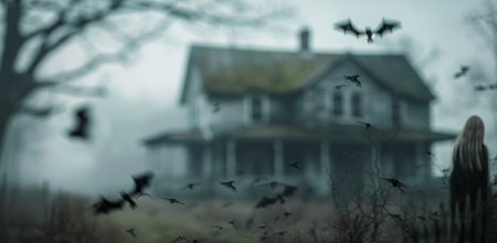An eerie abandoned house stands in a misty forest, enveloped by fog as bats flutter around, adding to the haunting atmosphere during twilight hours.