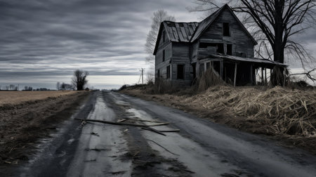 A weathered wooden fence stands before a dilapidated farmhouse, evoking a sense of rural decay and abandonment in a monochrome landscape. Focus on texture and mood.