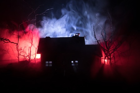 house with red smoke in the dark. Halloween concept. 3d rendering