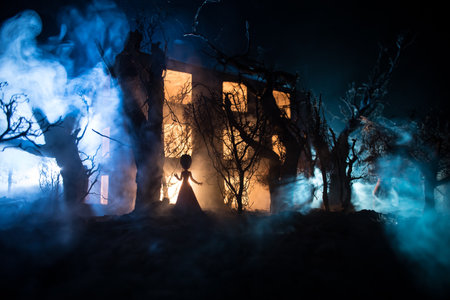 Old house with a Ghost in the forest at night or Abandoned Haunted Horror House in fog. Old mystic building in dead tree forest. Horror Halloween concept.