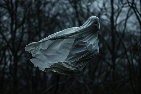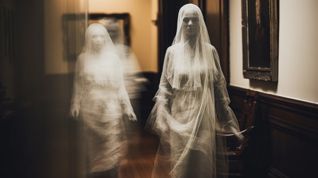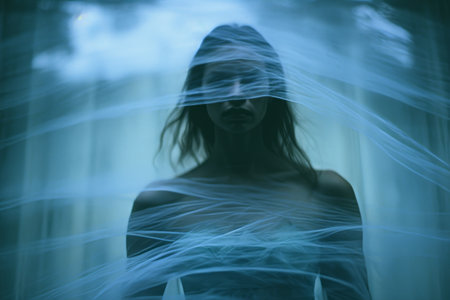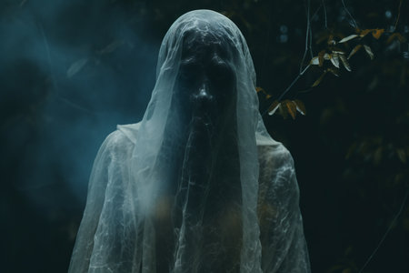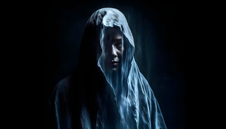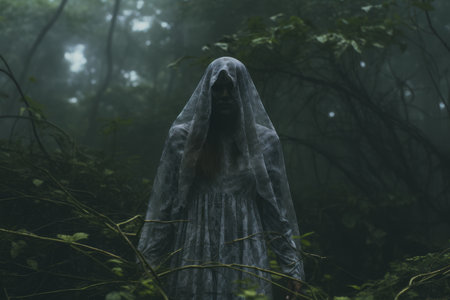 Mystical apparition of ethereal veiled figure in dark atmosphere.