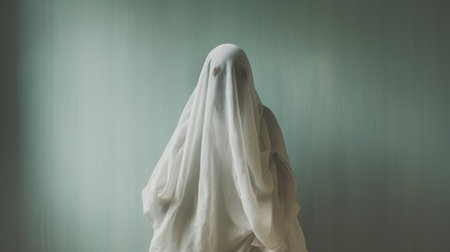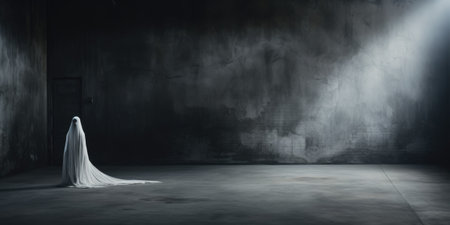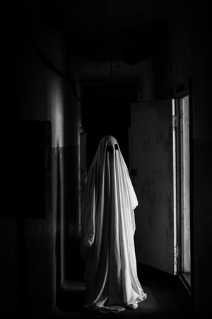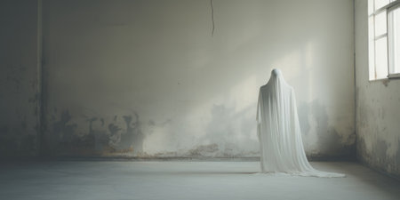 A person dressed as a ghost in a building. Generative AI.